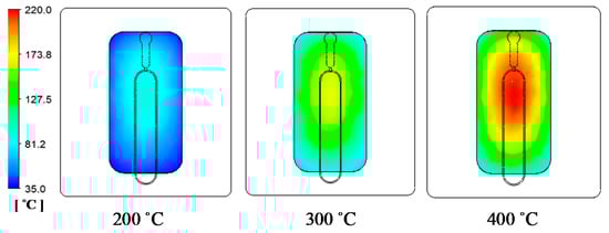 In the GMTC method, the gas temperature is an important element, which can be represented by the heating source. In the application of GMTC, a higher gas temperature causes the heating rate to increase. However, the amount of wasted energy will also increase. Therefore, in this study, this was investigated with the model shown in Figure 5 and Figure 6 with gas temperatures of 200, 300, and 400 °C, a product thickness of 0.5 mm corresponding to the stamp thickness of 1 mm and a heating time of 20 s.