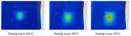 Figure 11 and Figure 12 show the temperature distribution under different air temperatures with a stamp thickness of 1 mm. This result shows that with the higher inlet temperature, the heating process became more effective, resulting in a higher temperature at the center of the plate, as well as the temperature difference on the plate increasing. In detail, based on the simulation result, the temperature differences along the center line of the stamp were 54.2, 79.1, and 85 °C, with inlet temperatures of 200, 300, and 400 °C, respectively. In this paper, a comparison was performed between three different inlet temperatures, as shown in Figure 13a. To verify the accuracy of the simulation result, the experiment was performed with the same gas gap. The temperature at five sensors was collected and compared, as shown in Figure 13b–d, and the temperature distribution is shown in Figure 12. The comparation shows that the simulation and the experiment have a good agreement. In other research on the GMTC [,,,,,], the heating process was influenced by another wild source; however, with the In-GMTC, the heating was achieved in the private volume, meaning that the simulation and the experimental result exhibited good agreement. Therefore, this heating method could be easier to predict by simulation than the external GMTC. Figure 13b–d shows that the mean temperature in the experiment was slightly lower than the simulation result. This was due to the fact that the simulation results show the temperature at the end of heating step exactly; however, in the experiment, there was a delay time associated with the thermal camera obtaining the thermal picture, and in this delay time, the thermal energy at the higher temperature area was transferred to the lower temperature area, resulting in a lower temperature being obtained by the thermal camera.