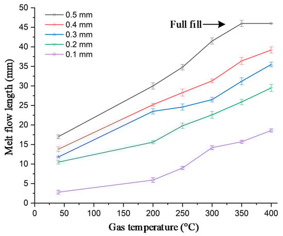 The melt flow length of a 0.5 mm part thickness with and without In-GMTC under different hot gas temperatures.