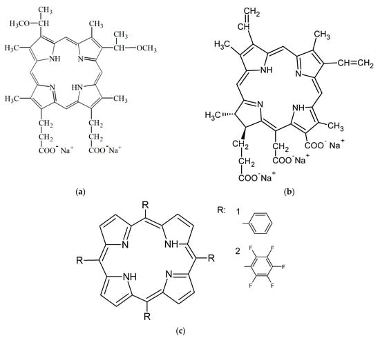 Structural formulas of porphyrins: disodium salt of 3,8-di (1-methoxyethyl) deuteroporphyrin IX (a), three sodium salt of chlorin e6 (b), 5,10,15,20-tetraphenylporphyrin (c, 1) fluorinated tetraphenyl porphyrin-5,10,15,20-tetrakis (pentafluorophenyl) porphyrin (c, 2).
