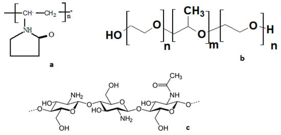 Structural formulas of polymers: poly-N-vinylpyrrolidone (a), ternary block copolymer of ethylene and propylene oxide, Pluronic F127, where n = 65; m = 200 (b), chitosan (c).