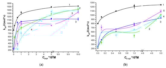 We have previously shown that solubilization of TPP and its analogs with amphiphilic polymers (AP), such as pluronics (ternary block copolymers of ethylene oxide and propylene oxide), polyethylene oxide and PVP, makes it possible to obtain effective water-soluble photosensitizers for the generation of singlet oxygen [24]. Figure 6 demonstrates the dependences of keff of the photo-oxidation rate of tryptophan in the presence of TPPF20 (a) and TPP (b), solubilized by Pluronic and the dependence of their ternary systems with chitosan on the concentration of Pluronic F127. It can be seen that in the case of TPPF20-F127 systems, the addition of chitosan (Figure 6a, curves 2–4) leads to an increase in photocatalytic activity by a factor of 1.1–1.3 compared to the activity of TPPF20 solubilized by Pluronic F127 in acidic or neutral media. This growth is primarily associated with the effect of acetic acid on the activity of porphyrins (see curve 1 (neutral medium) and curve A (0.2% CH3COOH), Figure 6a). In the case of hydrophobic TPP solubilized with F127, keff does not change neither in the presence of CT100 (Figure 6b, curves 2–4) nor in the presence of acid (Figure 6b, curve A).