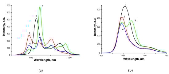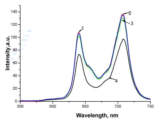 Fluorescence spectra for PS: DMG (a, curve 1) and Ce6 (b, curve 1), PS complexes with chitosan (curve 2) and for ternary systems: PS-PVP-CT100 (curve 3), PS-F127-CT100 (curve 4). The concentration of porphyrin is C = 5 × 10−6 M, CCT100 = 6 × 10−4 M, CAP = 10−4 M.