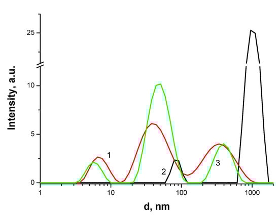 Size distribution of associates of TPPF20-F127 (1), CT100 (2), TPPF20-F127-CT100 (3) in aqueous and acetic acid solutions. The concentration of porphyrin C = 5 × 10−6 M, the concentration of CT100 is 0.05 mass% and concentration of F127 is 1 mass%.