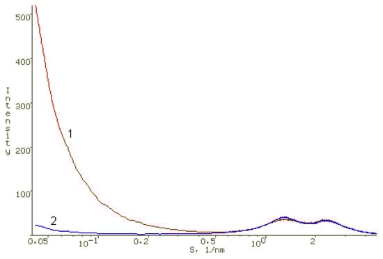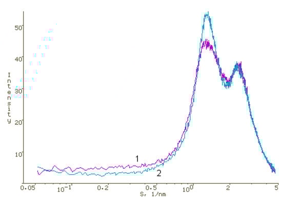 Experimental X-ray diffraction pattern of a chitosan-PVP film (1) with a mass ratio of these polymers of 1:2 and a model X-ray diffraction pattern of such film (2) obtained by summation of X-ray scattering intensity of chitosan and PVP films taken in a 1:2 proportion. Logarithmic scale along the abscissa axis.