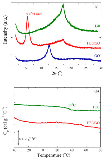 (a) X-ray diffractograms of 50 wt% H30/50 wt% graphite oxide (GO) together with neat H30 and neat GO. (b) Differential scanning calorimetry (DSC) thermograms of H30 and 50 wt% H30/50 wt% GO in terms of heat capacity. In both (a) and (b) the curves have been shifted vertically for clarity.