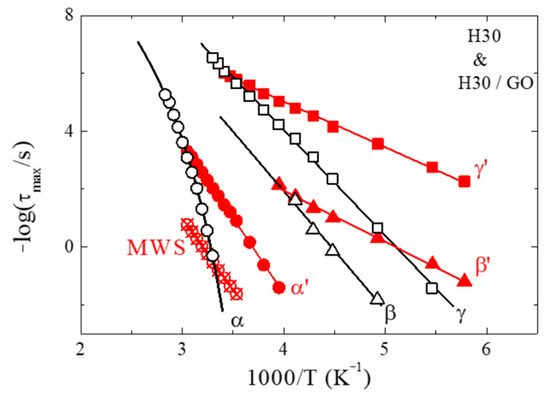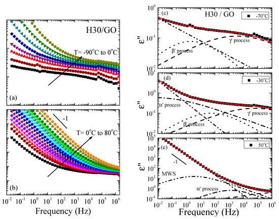 Figure 2a,b show the frequency dependence of the imaginary part of the complex permittivity, ε”, for the H30/GO nanocomposite as a function of frequency over a wide range of temperatures both below (Figure 2a) and above (Figure 2b) the glass transition temperature. The respective measurement for the H30 polymer is shown in Figure S1 in the Supplementary Material. At low temperatures, the spectra exhibit multiple relaxation processes, as evidenced by the breadth of the curves, similar to the data for the pure H30 polymer; nevertheless, the curves have a very different shape and lower dielectric strength. In this case, as well, the processes may be attributed to motions of the functional groups present in the molecules, such as the hydroxyl rotation and the ester reorientation. At higher temperatures, but still below the glass transition temperature of the neat polymers (no calorimetric Tg has been observed by DSC for the nanohybrids), an additional relaxation process appears in the spectra. At even higher temperatures, another process appears, together with a conductivity contribution, in all nanocomposites, that may be attributed to the Maxwell-Wagner-Sillars (MWS) polarization effect, due to the presence of surfaces; the latter appears commonly in dielectric spectra of inhomogeneous materials like suspensions or colloids, biological materials, phase separated polymers, blends, and crystalline or liquid crystalline polymers [72].
