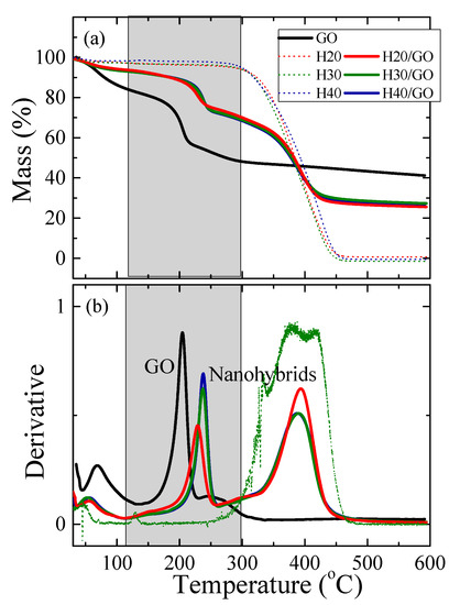 Following the investigation of the static and dynamic behavior of the hyperbranched polymers when confined between the layers of graphite oxide, an attempt was made to change the structure of the nanoadditive in the presence of the polymer, and study how this would affect both the structure of the nanohybrid as well as the dynamic response of the polymer. It is well known that thermal annealing of GO at temperatures above 190 °C results in its de-oxygenation, i.e., the consecutive removal of the various oxygen species from its layers. At the same time, thermal reduction in the presence of the polymer would reveal the influence of the polymer on the reduction mechanism of the GO. Figure 4 shows the thermogravimetric analysis measurements in terms of mass loss as a function of temperature for the three polymers of the different generations, for the GO and for the nanocomposites with composition 50 wt% polymer and 50 wt% GO. The three polymers are completely stable up to ~280 °C; at higher temperatures, their decomposition starts, proceeding in multiple steps. Initially, there is a small decomposition step with a most probable decomposition temperature that shows a strong dependence on the generation being Td~348 ± 2 °C for H20, Td~333 ± 1 °C for H30 and Td~320 ± 2 °C for H40, i.e., it decreases with increasing the generation of the hyperbranched polymer, whereas the corresponding mass loss increases with generation. At higher temperatures there are two additional decomposition steps, at ~380 ± 2 °C and ~420 ± 2 °C. The former has an amplitude decreasing with the generation, whereas the opposite trend is observed for the latter. All decomposition temperatures were identified utilizing the first derivative of the corresponding mass loss curves (shown in Figure 4b as well, for H30).