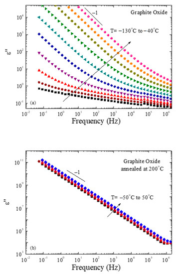 Graphite oxide is considered an insulator due to defects in the parent graphene layers that are caused by the oxidation reactions; however, thermal reduction apparently creates a percolated network of rGO layers, which is anticipated to increase its conductivity. Dielectric spectroscopy was utilized to measure the dielectric response of graphite oxide before and after thermal reduction. Figure 7a shows the imaginary part of the dielectric permittivity of GO that was kept in vacuum overnight to remove any traces of humidity. A relaxation process of very low dielectric strength is evidenced only at the lowest temperatures. This can be associated with the motion of the functional groups present on the GO surface. It should be mentioned that the relaxation times resulting from the analysis of these spectra are much faster than any relaxation process obtained for either the polymers or the nanocomposites discussed in the previous section, and do not interfere in any way with the results presented there. As the temperature increases, the larger part of the spectra is covered by the contribution of conductivity, shown by the ω−1 dependence of the ε” curve. Dielectric measurements were performed for GO following thermal annealing at 200 °C (and, thus, after its reduction). The imaginary part of its dielectric permittivity is shown in Figure 7b as a function of temperature. It is clear that the de-oxygenation and the change of the GO structure results in a completely different dielectric response, since the graphene oxide layers after reduction are conductive and, thus, the whole spectra at all temperatures, including room temperature, are dominated by the conductivity over the whole frequency regime.