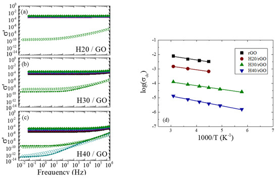 Figure 8d shows a comparison of the dc conductivity for the three nanocomposites, in an Arrhenius representation, to that of the rGO. The dc conductivities for rGO are determined by the analysis of the dielectric spectra of Figure 7b utilizing Equation (2) (although the data are dominated by the conductivity contribution) whereas the dc conductivities of the nanocomposites by the low frequency limit of the σ’(ω) data of Figure 8a−c. The temperature dependence of the dc conductivity, when conduction is due to some carrier hopping mechanism, as usual in disordered systems, is given by Mott’s law [76], where T* is a characteristic temperature related to the localization and density of the states contributing to conduction and is essentially related to the state of disorder in the system and the exponent γ is related to the dimensions and the variability of the transport process; γ = 1 for a fixed range hopping model whereas γ < 1 for a variable range one with the values γ = 1/2, 1/3 and 1/4, indicating conduction in 1, 2 or 3 dimensions, respectively [77]. The data of Figure 8d show a linear dependence of with 1/T, signifying that γ = 1; however, the narrow temperature range of the measurements should be taken into consideration. In a similar study, nanocomposites based on polyvinylidene fluoride (PVDF) with different carbon-based additives, at different concentrations, were similarly characterized by dielectric spectroscopy [78] and the data were consistent with the formation of a percolated network.