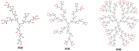 Three commercial hyperbranched polyester polyols (Scheme 1) that were supplied by Polymer Factory were utilized in the current work. They are the second (H20), third (H30), and fourth (H40) pseudo-generations of the Boltorn Premium Series hyperbranched polymers with average molecular weights of 1750, 3608 and 7323 g/mol, respectively; their names are BoltornTN Premium H20, BoltornTN Premium H30 and BoltornTN Premium H40 (https://www.polymerfactory.com/boltorn, accessed on 2 March 2021). Their branches consist mainly of ester groups and possess an increasing number of hydroxyl end-groups with increasing generation (i.e., an average of 16 for H20, 32 for H30 and 64 for H40). It is these functional groups that make the polymers highly polar and hydrophilic and, thus, soluble in water. At the same time, they render the molecules capable of forming both intra- and inter-molecular hydrogen bonds between the hydroxyl groups and the oxygens of the ester groups.