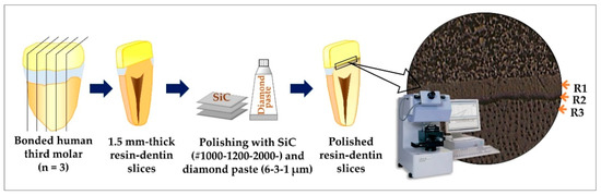 As shown in Figure 2, one central slice from each tooth was selected, prepared, and tested for E following a protocol described by Chowdhury et al. [33]. Each bonded dentin slice was sequentially finished with 1000-, 1200-, and 2000-grit waterproof SiC paper under running water and polished with 6-, 3-, and 1-µm diamond pastes for 1 min each. The specimens were cleaned with an ultrasonic unit with distilled water for 3 min after each finishing and polishing step.
