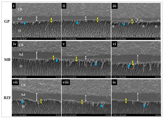Representative SEM images of interfacial structures (1000×) of the tested adhesives—GP (G-Premio Bond), MB (Clearfil Megabond 2), and BZF (BZF-29). Double-ended white arrows represent the extension of the adhesive layers measured at left lateral (i,iv,vii), central (ii,v,viii), and right lateral (iii,vi,ix) spots of each bonded dentin slice. The electron-lucent area between the twin yellow arrows demarcates the hybrid layer. Blue arrows indicate resin tags. The striped arrows show gap formation at the resin-dentin interface (iii). CR—composite resin; Ad—adhesive layer; D—dentin.