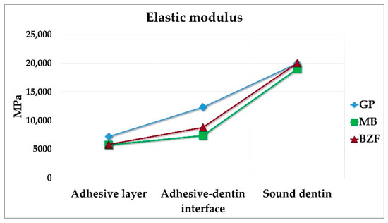 Van Meerbeek et al. reported a significantly lower elastic modulus of the adhesive-dentin interface than that of unaltered dentin and a gradual increase, starting from a softer adhesive layer, followed by a continued increase at the relatively harder adhesive-dentin interface, ultimately reaching the highest values in the stiffer dentin [17]. The gradual transition of the mechanical properties across the resin-dentin area contributes to bond strength by relieving the stresses between the shrinking composite resin and the rigid dentin. The E results and the gradient of values across the resin-dentin area demonstrated in this study concur with this report (Table 3 and Figure 5) and further substantiate the bond strength results. According to our findings, the E of the adhesive layer and adhesive-dentin interface of MB and BZF was similar (p > 0.05) but significantly lower than those of GP (p < 0.05), indicating an inverse relationship with their bond strength. Freitas et al. reported similar observations with one-step and two-step self-etch adhesives and concluded that lower E yielded higher bond strength, imparting adequate resistance of the adhesive to elastic deformation under stress [54].