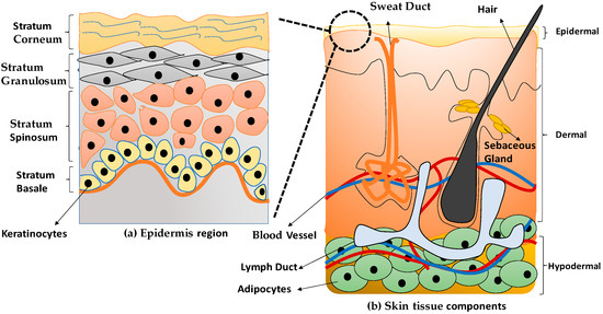 The anatomical structure of skin tissue (a) epidermis layer and (b) skin tissue components.