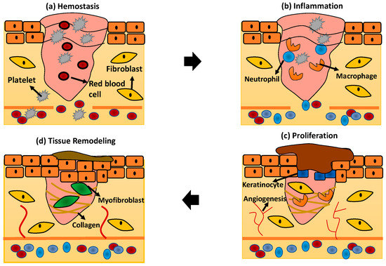 The wound healing phases (a) hemostasis; (b) inflammation; (c) proliferation; and (d) tissue remodeling.