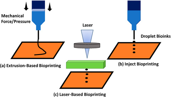 Different types of printing techniques: (a) extrusion-based bioprinting; (b) inject bioprinting; and (c) laser-based bioprinting.