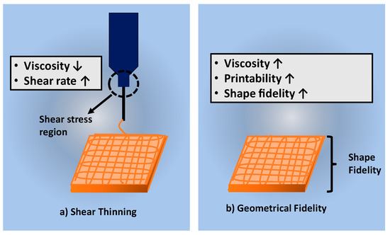The ideal characteristics of hydrogel have become the primary concern in 3D bioprinting because it needs to possess hydrated network properties that are important for gas exchange, nutrient transportation, and metabolite wastes removal for healthy cells and to promote cell viability [65]. The biomaterials must pose a characteristic that can be incorporated with living cells and to maintain the normal pH of the bioinks to ensure suitability for the cells. In addition, all biomaterials must have shear thinning properties because it is incorporated with printing difficulties. The shear-thinning properties of the hydrogels depend on the viscosity of the bioinks. The hydrogel must have the ability to heal after facing shear stress during printing.