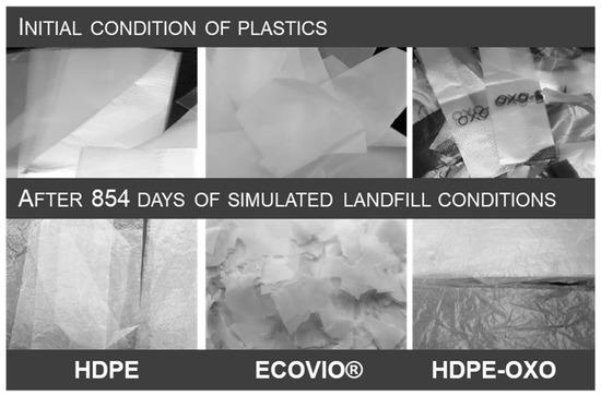 The attained degradation of the plastics in this assessment resulted from concurrent abiotic and biotic factors, as it was not possible to isolate the biodegradation process. This fact reflects the difficulty of assessing biodegradation when experimental conditions try to reproduce the conditions of real landfills. However, based on the results, it is evident that oxo-degradable and compostable plastics will not biodegrade readily in landfills. This fact should be known and understood for decision-makers to match the materials’ characteristics to the features of the waste management systems.