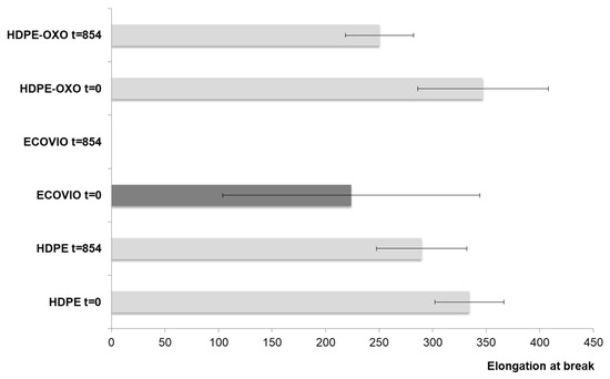 The loss of mechanical properties is used as an indicator of plastic degradation [38,39,40,41]. In this case, the elongation at break of the films was measured at the end of the experiment and compared to their initial value. It was not possible to measure the final value for ECOVIO® because of the fragmentation of this plastic (Figure 1), which indicated a complete loss of physical integrity that could be related to the degradation. While PEAD and PEAD-OXO both showed some loss of the referred property (Figure 2), there is no significant statistical difference between the initial and final values. On average, the elongation at break decreased by 27% for PEAD-OXO and 13% for PEAD; the higher loss of mechanical properties in OXO-PEAD could be expected because of the prooxidant additive in the plastic. The elongation at break is not linearly related to the plastics’ chain length; even an extensively weathered, embrittled plastic has an average molecular weight in the tens of thousands g/mol [4].