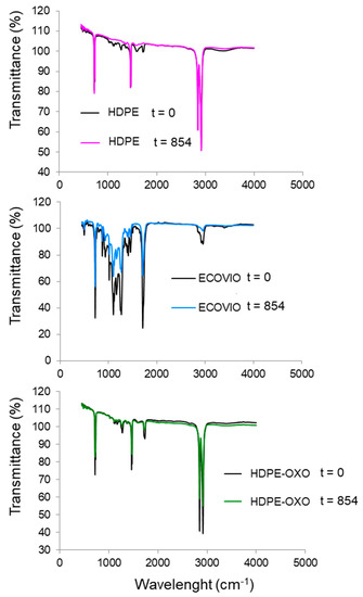 FTIR allowed the identification of distinct functional groups based on previously reported data [40,42,43,44,45]. As shown in Figure 3, the conventional HDPE profile did not show significant changes, as it kept the same characteristic peaks [46,47]. A decrease in the peaks related to the C=O and OH groups was also observed. Similar behavior was observed in PEAD-OXO. On the other hand, ECOVIO® showed a decrease in the intensity of the peaks, which was related to the higher mobility of the molecules due to changes in the flexibility of the film [48]. The main change was the disappearance of the peak attributed to the ketonic C=O groups.