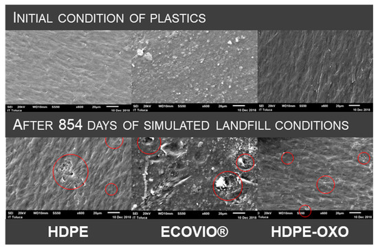 SEM images of high-density polyethylene, compostable plastic ECOVIO®, and oxo-degradable polyethylene films after exposition to simulated landfill conditions.