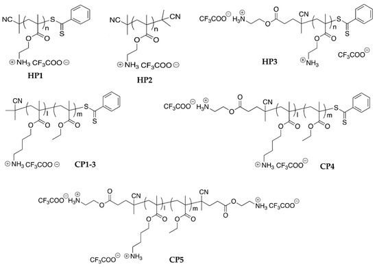 The polymer HP2 and CP5 were prepared by transforming the RAFT (dithioester) end group by radical-mediated reaction using AIBN. Due to the lack of phenyl end group, the DP of these polymers cannot be determined by 1H NMR analysis. The DP values used for Mn calculations are those of precursor polymers.
