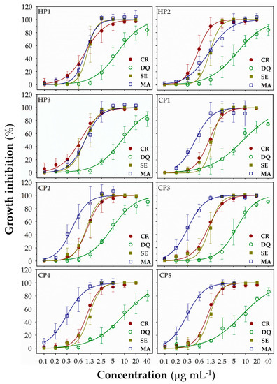The tested polymers were active against all four autotrophic microorganism species. SBPs caused a concentration-dependent decrease of their growth (Figure 3) with the 72hIC50 (the concentration of polymer causing a 50% inhibition of the cyanobacterial or algal growth after a 72-h exposure) values ranging from 0.2 to 9.1 μg mL−1 (Table S2). All SBPs inhibited CR and SE growth within a relatively narrow concentration range (72hIC50: 0.6–1.2 μg mL−1) and were less efficient against DQ (about ten times higher IC50 values; 72hIC50: 4.9–9.1 μg mL−1). The most sensitive species was MA, with the minimal 72hIC50 values up to three times lower than for SE and CR (72hIC50: 0.2–1.1 μg mL−1).
