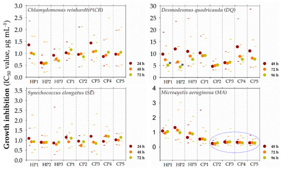 Further, the time-dependency of growth-inhibitory activity was evaluated. We screened polymer activity for 24–72 h or 48–96 h exposures (Figure 4 and Table S2). The polymers inhibited the growth of the tested microorganisms within the first 24 h (CR and SE) or 48 h (DQ and MA). For most polymers, IC50 values did not strongly change with increasing exposure duration (72–96 h). Only the activity of homopolymers HP1 and HP2 against DQ significantly (two-times) increased within time (Figure 3; 48hIC50 = 9.7 and 11.9 vs. 96hIC50 = 5.1 and 4.3 μg mL−1, respectively). Anti-algal and anti-cyanobacterial activities were not structure-dependent even after shorter exposure times except for MA. Copolymers CP2–5 with ~30% hydrophobic groups were significantly (almost five times) more active against MA after 48 up to 96 h than homopolymers (0% hydrophobic groups), while the effects of the most hydrophobic copolymer CP1 (47.5% hydrophobic groups) were in between homopolymers and copolymers CP2–5.