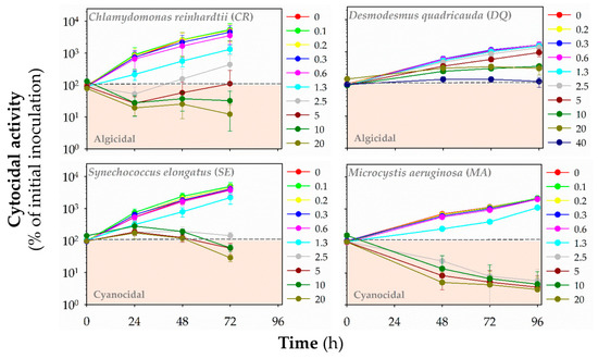 Growth inhibition assay was conducted in a microplate format (96-well plates Greiner Bio-One, Kremsmünster, Austria; cat. no. 655201), as reported previously [21]. Briefly, the initial cell concentration (initial inoculum of cells that reached the exponential growth phase diluted in the ZBB medium) was ca. 1 × 107 cells mL−1 for cyanobacteria and 1 × 106 cells mL−1 for algae. Optical density at 680 nm (OD680) is directly related to cyanobacterial or algal density (cell number) in culture media. The OD680 was measured using Synergy MX microplate reader (Biotek, Bad Friedrichshall, Germany) at the beginning of each experiment (time = 0 h), 24, 48, and 72 h for faster-growing species CR and SE, and after 48, 72, and 96 h for slower-growing species DQ and MA [21]. A typical image of a 96-well plate at the end of the growth inhibition assay is shown in Figure S1B.