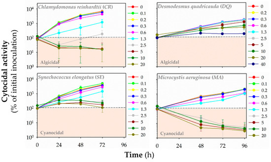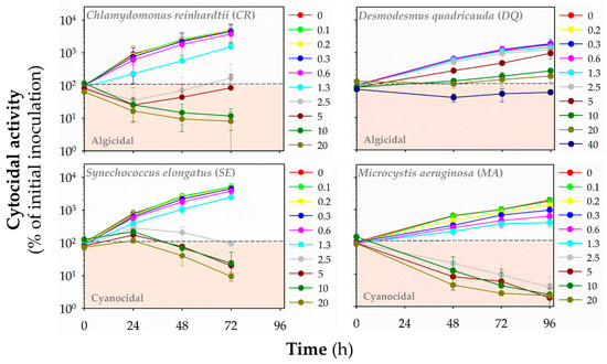 The viability status of algal or cyanobacterial cells can be assessed by measuring the fluorescence of chlorophylls and other photosynthetic pigments, whereby a lack of fluorescence indicates the irreversible damage and death of the cell connected with the disappearance of fluorescence [24,25,26]. Algicidal/cyanocidal activity assay was based on decreased autofluorescence of algal or cyanobacterial cells below the level of inoculated cells. The assay was done as reported previously [21]. The experimental set-up was the same as for the growth inhibition assay. A decline of cell numbers below initial inoculum indicating algicidal or cyanocidal activity was evaluated by monitoring autofluorescence from photosynthetic pigments (λex = 485 nm/λem = 675 nm for green algae; λex = 590 nm/λem = 675 nm for cyanobacteria) using Synergy MX microplate reader (Biotek) measured at the same time points as an optical density for growth inhibition assay. A typical image of a 96-well plate at the end of the algicidal/cyanocidal activity assay is shown in Figure S1B.