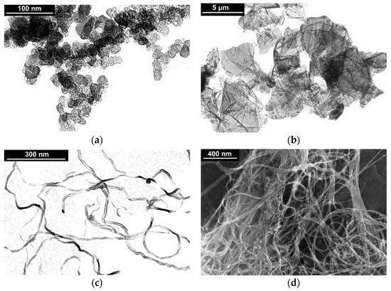Results of transmission (a–c) and scanning (d) electron microscopy for the powders of various carbon nanoparticles used as the fillers ((a)—carbon black (CB); (b)—graphene nanoplatelets (GnPs)s; (c)—multiwalled carbon nanotubes (MWCNTs); (d)—single-walled carbon nanotubes (SWCNTs)).