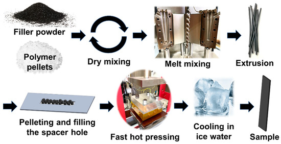To determine the percolation thresholds for the composites filled with various types of the filler particles before their any additional thermal treatment, samples in the form of plates 12 mm × 60 mm × 1 mm in size were prepared from the granules of the composites by fast hot pressing (200 °C, pressure 3 MPa, time in a melt state <1 min). Cooling was performed by immersing the composite samples in ice water. The corresponding full composite processing scheme is presented in the Figure 2.