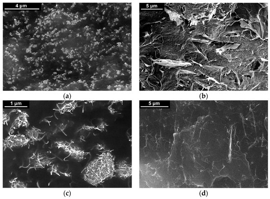 Results of scanning electron microscopy of low-temperature cleavages of composites based on PP filled with carbon nanoparticles with certain weight content: (a)—15 wt.% CB; (b)—10 wt.% GnPs; (c)—7.5 wt.% MWCNTs; (d)—0.5 wt.% SWCNTs.