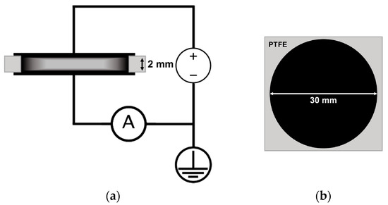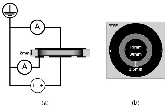 To carry out kinetic measurements of the electrical resistance of the composite melts, granules of the prepared composite of various compositions were placed between two flat electrodes in a heated mold inside a circular hole of a spacer made of polytetrafluoroethylene (PTFE) (Figure 4). Required total amount of the granules was calculated based on the volume of the cavity formed by the PTFE spacer hole and the electrodes, taking into account the content of the filler in the composite and the density of the composite components. The composite granules were quickly heated to 205 °C, after which a pressure of 5 MPa was gradually applied to the composite melt. The temperature and pressure values were maintained for the duration of an experiment. A constant electrical voltage was applied between the electrodes during the entire experiment time. The voltage was provided by a highly stable AKIP 1147/1 power supply (Prist, Moscow, Russia). The standard preset value of the electric voltage was 2 V. The picoammeters 6485/E (Keithley, Cleveland, OH, USA) and A2-4 (MNIPI, Minsk, Belarus) were used for the current measurements. During an experiment, the values of the electric current between the electrodes were continuously recorded using a multichannel analog-to-digital converter E14-440 (L-Card, Moscow, Russia) with a frequency of 100 Hz.