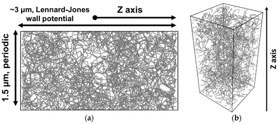 Several assumptions were made to create the representative composite volume elements. The first assumption was that what occurs in the bulk and in the near-surface layer depends weakly on the thickness of the composite at thicknesses higher than two lengths of a fully extended CNT. In this work, parameters of the MWCNTs NC7000 [33] were used to set the geometry of the simulated CNTs. According to this, the computational cell was represented as a parallelepiped 1.5 μm × 1.5 μm × 3 μm in size, which was confined in one direction (Z) by two walls characterized by an attractive potential, and was periodic in the other directions (X and Y).