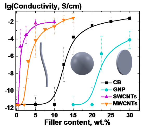 From analysis of the concentration dependences of the electrical conductivity of the composite materials for each type of the filler (Figure 6), the corresponding values of the percolation threshold cc. were estimated by fitting the curves with Boltzmann sigmoidal function [44]. The results are presented in Table 2.