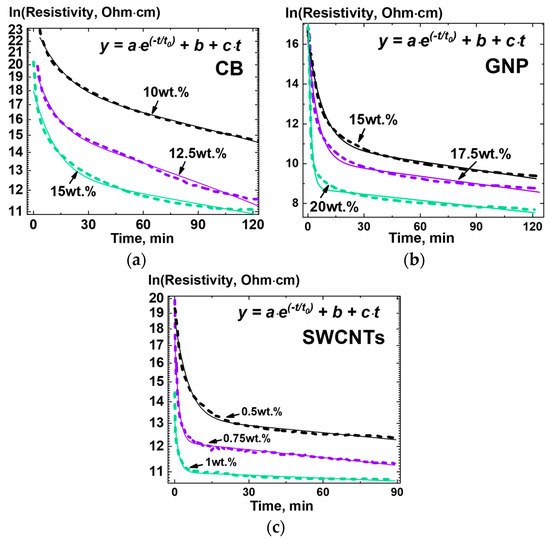 Experimentally obtained dependences of resistivity on time for melts of the composites PP/CB (a), PP/GnPs (b), and PP/SWCNTs (c) with approximation by the relation (4).