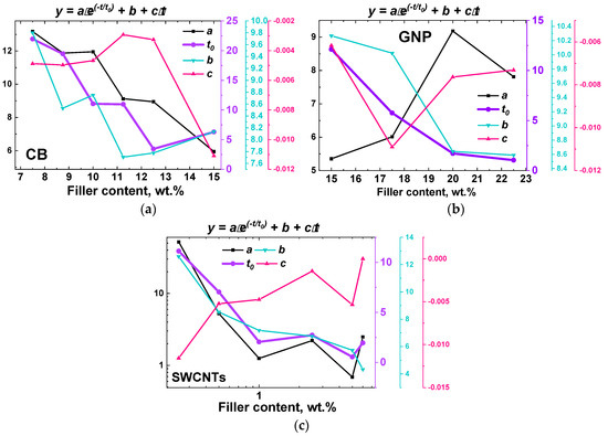 Dependences of the parameters of the equation (4) for the conductivity-time curves (Figure 7) on the filler content for the PP/CB (a), PP/GnPs (b) and PP/SWCNTs (c) composites.