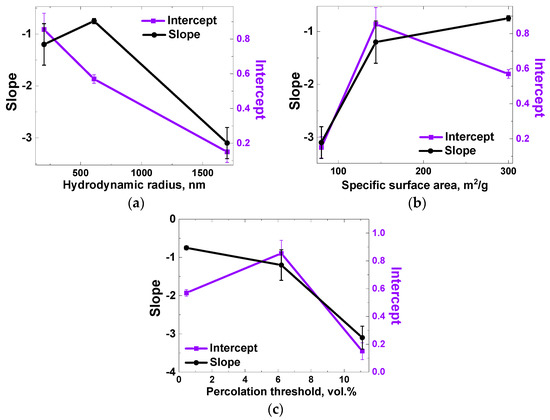 Slopes and intercepts of the quasilinear dependences of the logarithm of the characteristic time t0 of the fast (exponential) component (4) of the filler segregation kinetics on the relative filler content for PP/CB, PP/GnPs, and PP/SWCNTs composites (Figure 9) versus the filler particles hydrodynamic radius (a) and specific surface area (b), and the percolation threshold (c).