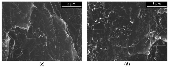 One of the main fillers used in this work was CB, as the most commonly used filler with a shape close to a globular (Figure 1a). Particularly, the commercially available electrically conductive CB of brand P267-E (equivalent of N 472, Institute of Hydrocarbons Processing of the Siberian Branch of the Russian Academy of Sciences, Saint Petersburg, Russia) with specific surface area of 144 m2/g (according to the filler specification [31]) was chosen. Another type of filler used was graphene nanoplatelets (GnPs), characterized by a planar texture formed by several stacked layers of graphene. In this work, GnPs of commercial grade AO-3 (Graphene Laboratories, Calverton, NY, USA) with specific surface area of 80 m2/g (according to the filler specification [32]) (Figure 1b) were chosen. Finally, two types of CNTs were used: MWCNTs and single-walled carbon nanotubes (SWCNTs). The commercially available MWCNTs NC7000 (Nanocyl, Sambreville, Belgium) were chosen, as the most uniform in diameter and size (length ~1.5 μm, diameter ~9 nm, specific surface area 250÷300 m2/g), as well as characterized by high purity (according to the filler specification [33]) (Figure 1c). SWCNTs of the commercial grade Tuball (OCSiAl, Novosibirsk, Russia) with specific surface area of 331 m2/g (according to Krestinin et al. [34,35]) were selected, as the most affordable and widely used SWCNTs with a high level of electrophysical characteristics (Figure 1d). The results of a comprehensive study of the Tuball SWCNTs, performed by Krestinin et al., are presented in the publication [35].