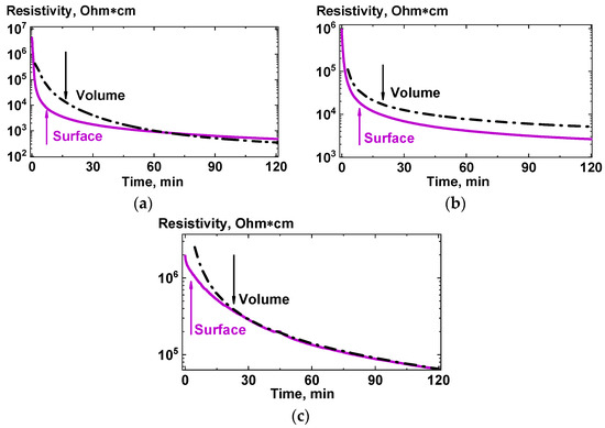 At the next stage of the study, the time dependences of the electrical resistivity of composite materials in a melt state were measured for each filler type and for a wide range of the filler content (Figure 7). The measurements were carried out according to the scheme shown in Figure 4, while the geometry of the mold was used to calculate the resistivity. The values of the content of the fillers for each filler type were chosen taking into account the corresponding percolation threshold values.