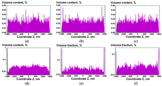 Results of numerical simulation using MD methods for composites containing CNTs with a total volume fraction of 0.5 vol%, for the distribution of the filler along the Z axis at a time step 0 (a–c) and at a time step 1000 (d–f) for different amplitudes of interaction forces: (a,d)—weak CNT/CNT, strong CNT/wall; (b,e)—strong CNT/CNT, strong CNT/wall; (c,f)—weak CNT/CNT, weak CNT/wall interactions.