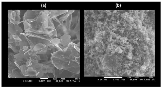 The surface morphology of the changes with Gr loading was performed by SEM. For a polymer-composite, the phase transformation of the morphology of the polymer with respect to nanomaterial has effects on the electrical conductivity of their hybrids. The SEM images of Gr and are shown in Figure 2. The shows a spherical gravel-like porous structure, which mounts on top of each other. From the analysis of the morphology, and are the surface area, diameter, and length of the polymer, respectively. The calculated Gr nanoplatelet average area, diameter, and length are: and , respectively. It is evident from the calculated size of the Gr that it has a large aspect ratio that is required to promote contact with the .