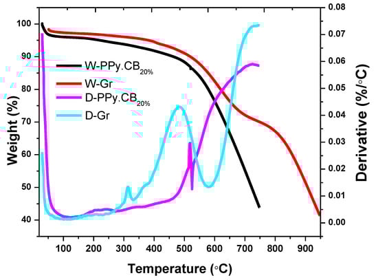 Temperature of analysis of Gr and . W-PPy.CB20% and W-Gr are the percentage weight curves. D-PPy.CB20% and D-Gr are the derivatives curves.