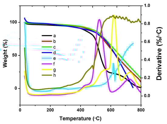 The hybrids temperature analysis: (a–d) percentage weight curve of 1:3, , , and (e–h) derivatives curve of , 1:3, , .