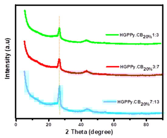 The conductivity of polymer-composites in relation to crystallinity can be explained by percolation theory: this means that the relationship between crystallinity and conductivity of polymer-composite is not linear. As the crystallinity of polymer increases with respect to filler content and when a point beyond percolation threshold is reached, the conductivity becomes independent of the degree of the crystalline structure of the composite [,]. Consequently, the XRD investigation of the is important to reveal their crystallinity in relation to electrical conductivity.
