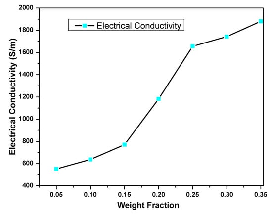 The laboratory-measured electrical conductivity values of the as-received Gr and are 2.04 × 10−3 S/m and 552 S/m, respectively. The electrical conductivity measurements for the can be found in Figure 9. As shown in Figure 9, the electrical characteristics of the changes as the weight fraction of the Gr changes. At Gr weight fraction of 0.15 wt.%, the hybrid begins continuous conduction, which connotes the percolation network formation. In other words, the percolation threshold of the hybrid occurred at 0.15 wt.%. At this point, there is a linear increment in the system’s electrical conductivity until 0.25 wt.%, when the hybrid begins to saturate. These results confirm the effectiveness and ability of Gr to improve polymers’ electrical conductivity at low or moderate quantity for diverse applications [,,,]. This, of course, can be attributed to the homogenous dispersion of Gr onto the matrix and the ability of Gr to link the carrier transport through the van der Waals force and the interactions exemplified by the materials [,].