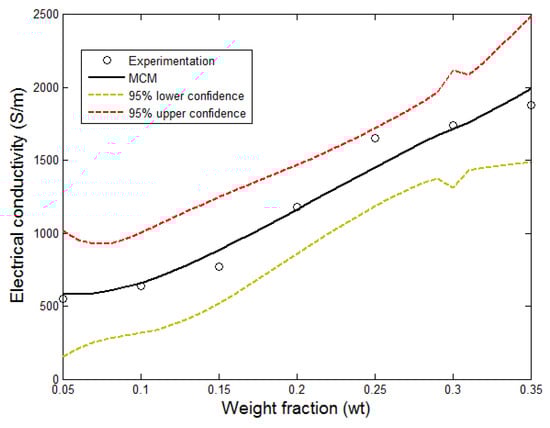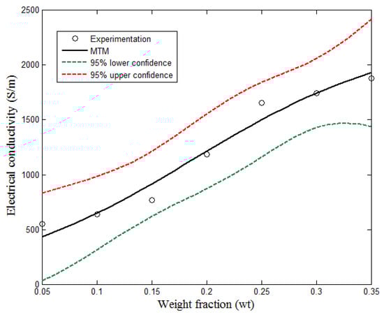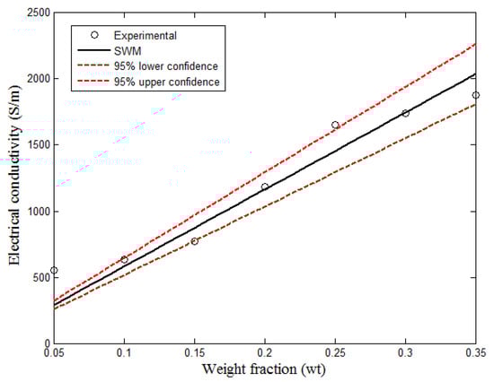 where is the weight fraction, is the sum of the matrix conductivity, the surface interaction effect, and the conductivity due to the aspect ratio, is the constant , is the weight fraction, and is the critical exponent. Table 2 provides the values of the calculated parameters of Equation (16), and the accuracy of the prediction.
