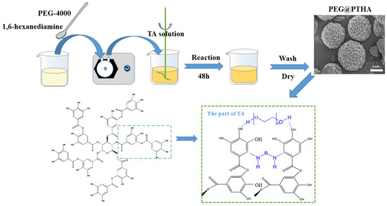 By adjusting the PEG/TA weight ratio and fixing the HA/TA mole ratio (12.5:1), four microsphere adsorbents were fabricated at room temperature including 0:1 (0-PEG@PTHA), 0.5:1 (PEG@PTHA), 1:1 (1-PEG@PTHA), and 2:1 (2-PEG@PTHA). Taking PEG@PTHA as an example, (1) 0.5 g PEG and 0.85 g HA were added into 50 mL UW and then ultra-sounded to disperse evenly; (2) 1.0 g TA was charged into 50 mL UW and dispersed uniformly; (3) the mixture of PEG and HA was added into the above TA solution by drop. The sediment was separated and alternately washed with UW and ethanol absolute three times. The resultant PEG@PTHA composite was finally dried via freeze-drying for next use. The preparation process of PEG@PTHA and its possible reaction mechanism can be seen in Figure 1.